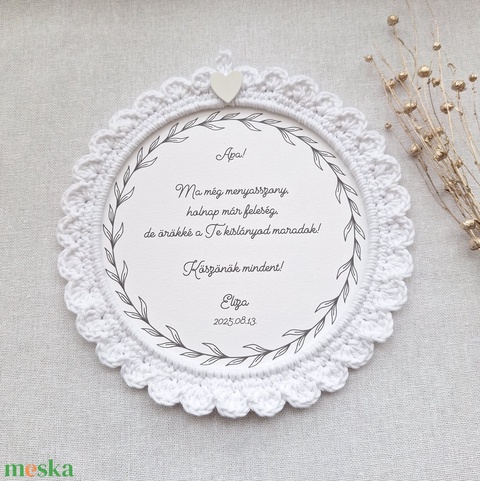 Szülőköszöntő horgolt kép - fehér, fa szívvel
