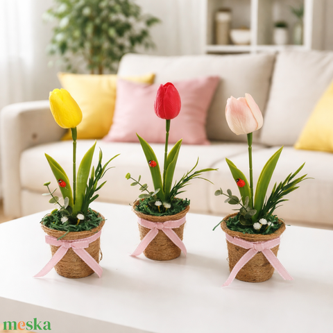 Élethű tulipános dísz saját készítésű kaspóban