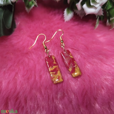 Arany-piros márványos polyclay fülbevaló – téglalap