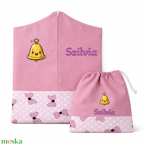 Ovis zsák + tornazsák szett névvel és jellel (rózsaszín + rózsaszín-pöttyös masnis), ajándék szeretetküldővel