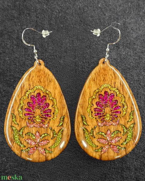 „Csillagvirág” – kézzel készült fa fülbevaló csillámos mintával