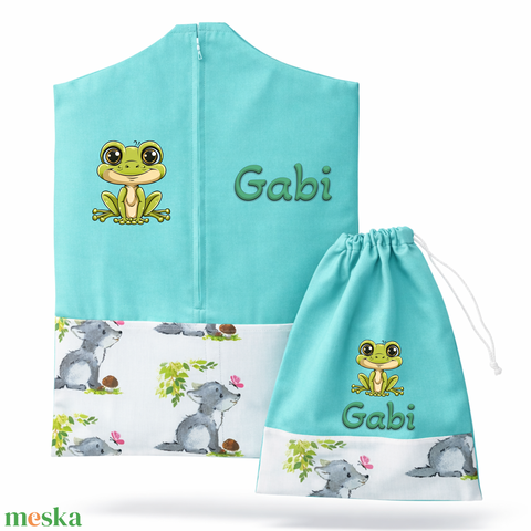 Ovis zsák + tornazsák szett névvel és jellel (mentazöld + farkaskölykös), ajándék szeretetküldővel