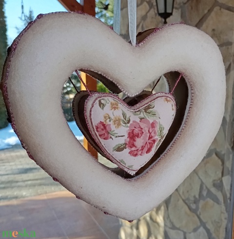 Kézzel készült ekrü filc szív rózsás textilbetéttel
