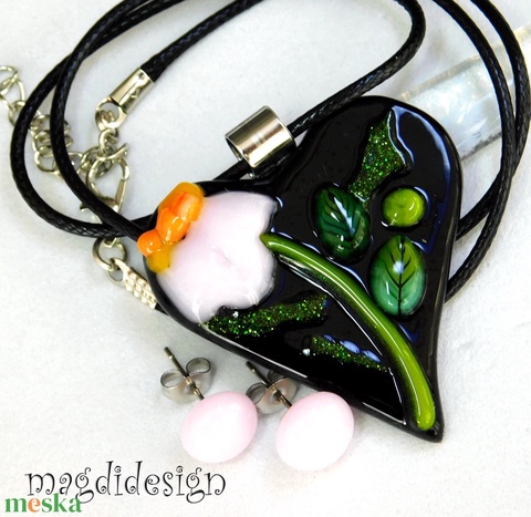 Fekete rózsaszín virágos szív üvegékszer szett, nyaklánc, pötty fülbevaló