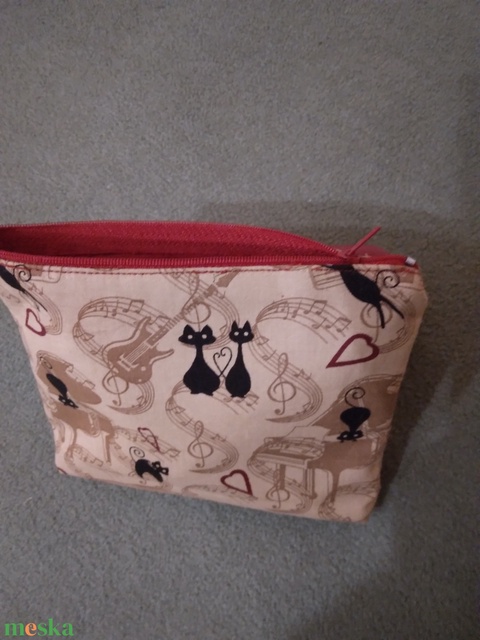 Mérete: 13 cm x 17 cm. Cicás, szíves , mintás karton anyagból készült. Piros karton béléssel,