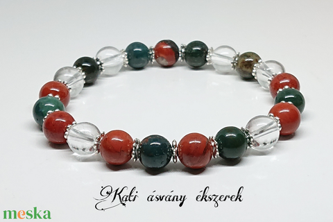 Ásvány neve, mérete: mohaachát db. 8 mm-es, vörös jáspis 7 db. 8 mm-es, hegyikristály 6 db. 8 mm-es