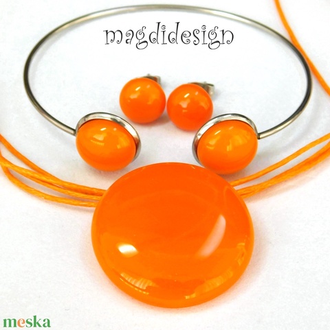 Narancssárga minimál design üvegékszer szett, nyaklánc, stiftes fülbevaló karkötő