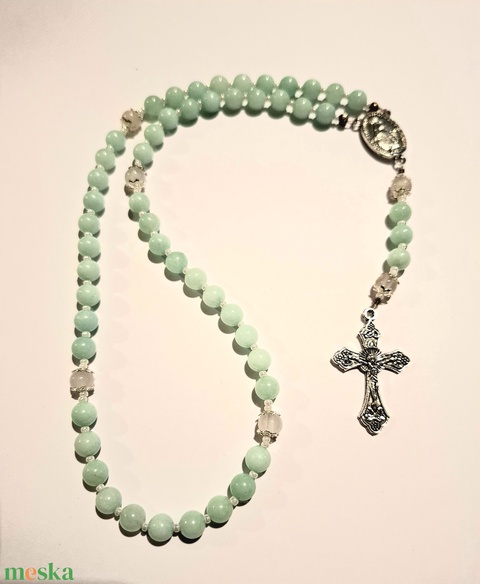 - Anyaga: miyuki kásagyöngy, ezüstözött gyöngykupak, ezüst színü rózsafüzér köztes érem és kereszt, amazonit gyöngy, fehér jade gyöngy, sodrony