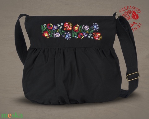 Itthon készült, egyedi tervezésű, Szervető-kalocsai hímzés-feldolgozással díszített, állítható pántú, buggyos táska, színes selyemcérnával hímezve. Felül cipzárral záródik.