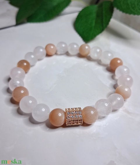 Rózsakvarc és holdkő ásvány karkötő cirkóniás dísszel