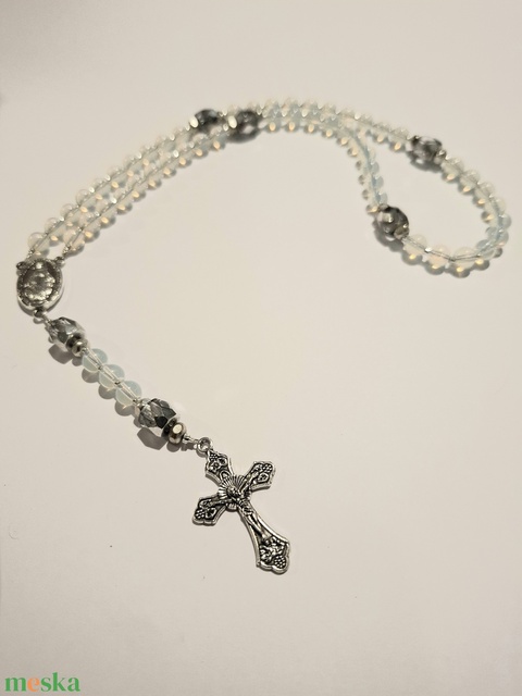 - Anyaga: opál quartz, ezüst színű köztes gyöngyök, miyuki kásagyöngy, ezüst színű rózsafúzér köztes és kereszt, sodrony