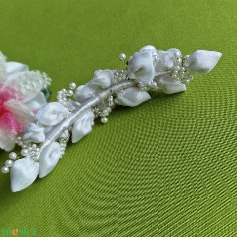 ESKÜVŐ HAD231 - Fehér szatén virágos. gyöngyös menyasszonyi hajpánt, hajdísz