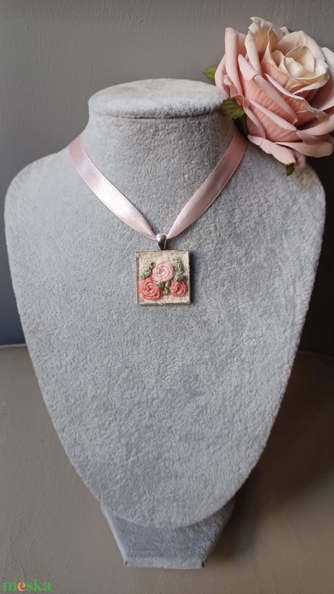 - Anyaga: hímzőfonal, medálalap, selyemszalag, delfinkapocs
