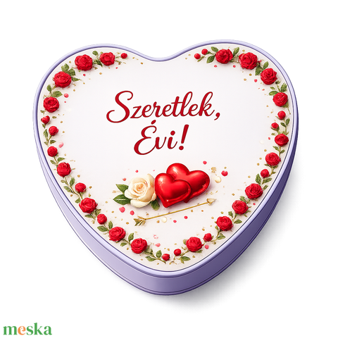 Egyedi, névvel nyomtatott Valentin-napi, szív alakú fémdoboz