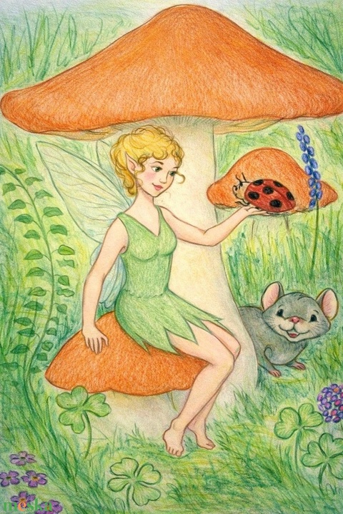 Pille tündér apró erdei állatokkal - mesés hangulatú kép gyerekszobába (digitális, letölthető)