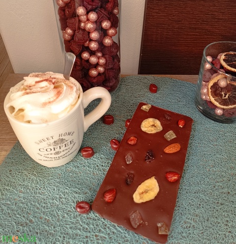 - Anyaga: kakaó, csokoládé, mogyoró, kesudió, pisztácia, mandula, aszalt áfonya, banán chips, mazsola
