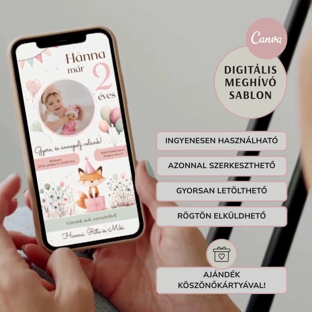 Digitális születésnapi meghívó Canva sablon - Róka móka - Szerkeszthető - Online küldhető - Nyomtatható, Rókás