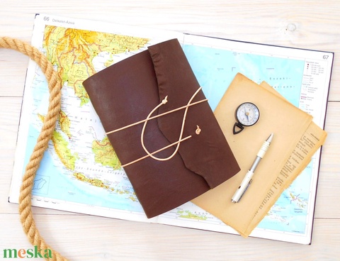 KALANDOR - Valódi bőr borítású kézműves napló A5 méretben - Iránytű motívummal