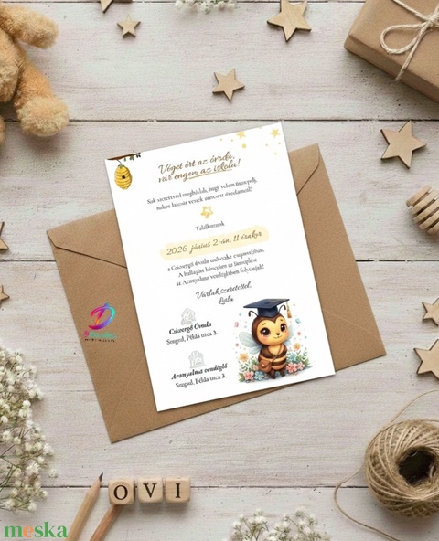 Kedves kis ballagó méhecskével díszített ballagási meghívó, ovisoknak és bölcsis ballagásra.