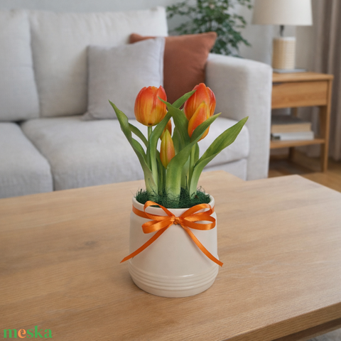 Élethű tulipánok kerámia kaspóban-narancs