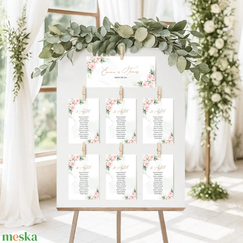 Ültetési rend, Esküvői Asztalszám, Rózsás Asztalszám, Esküvő Asztal, Ültetésirend, Ülésrend, Greenery, Zöld leveles