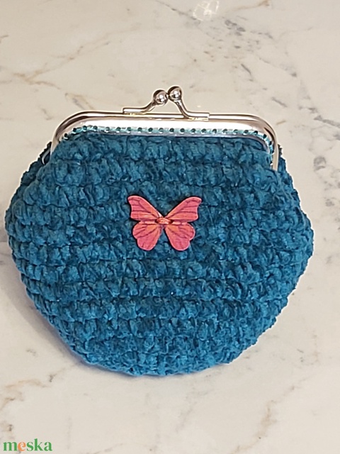 Elegáns puha tapintású sötét türkiz zöld horgolt mini csatos pénztárca különleges bársonyos zseníliafonalból készítve. Az elejét egy fából készült lepke dísz teszi egyedivé. A pénztárca 10 cm magas, így tökéletes választás aprópénzhez, fülhallgatóhoz, gyűrűkhöz, gyógyszerekhez, vagy bármilyen kis kincshez, amit jó ha mindig kéznél tartasz.