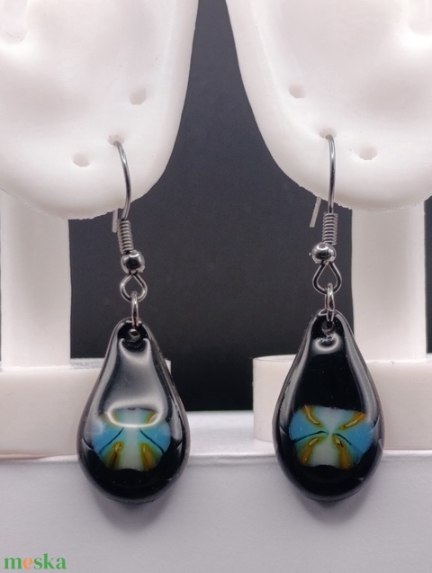 Csepp alakú fekete lógó fülbevaló stilizált pillangóval