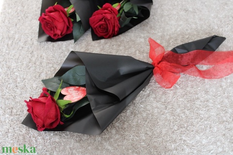 - Anyaga: bársonyrózsa, csomagoló, szalag, dekorkartontábla