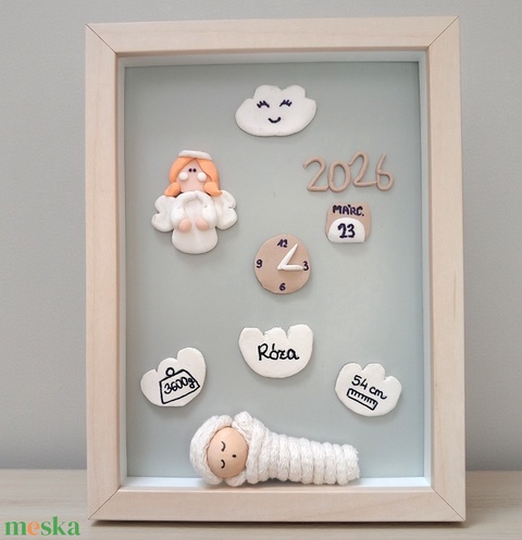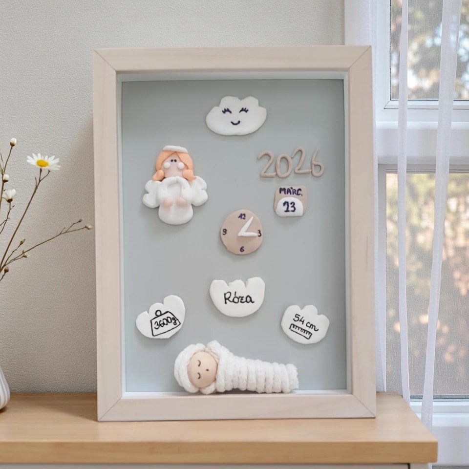 Egyedi babaváró ajándék – Makramé újszülött baba pólyában, személyre szabott születési adatokkal, fa képkeretben