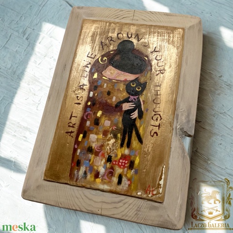 Hogy imádnám - Rusztikus Fatábla, Egyedi Falikép, Akril Festmény - Klimt után szabadon, Fekete macska, Cica