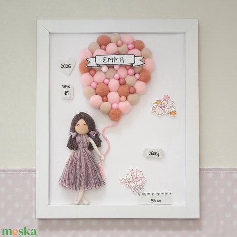 Egyedi, névre szóló babaváró ajándék – Makramé kislány lufival, születési adatokkal, fehér keretben