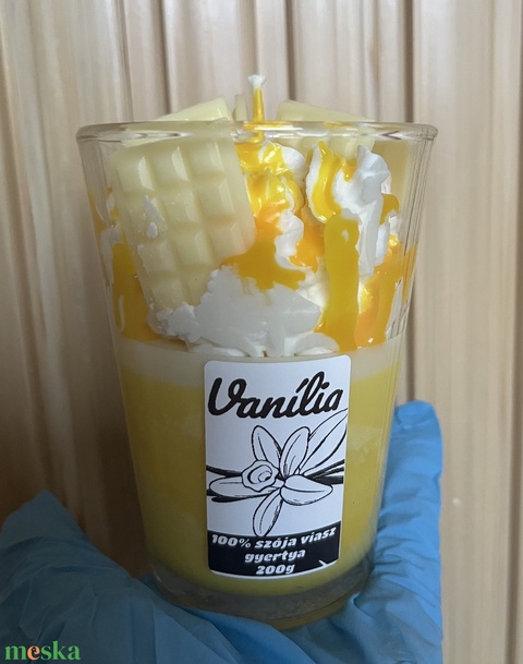 - Anyaga: szója viasz, pamut kanóc, illatolaj, folyékony színező anyag, üveg, fém kanóctalp