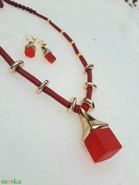 Arany-bordó hosszú lánc-fülbevaló garnitúra műgyanta kockával