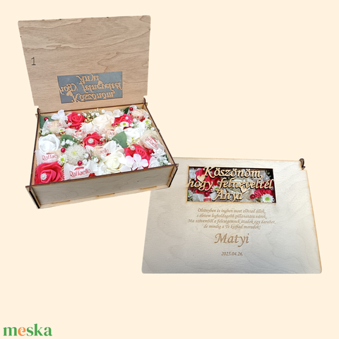 Szülőköszöntő ajándék esküvőre – egyedi gravírozott fa doboz virággal és csokoládéval (PLSZ1505)
