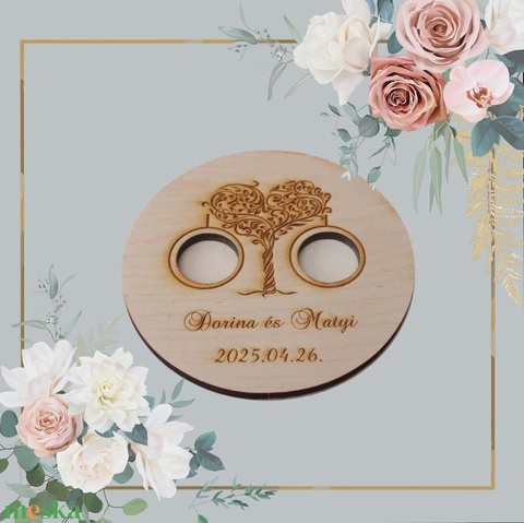 Egyedi fa gyűrűtartó esküvőre – gravírozott, kör alakú (PL09)