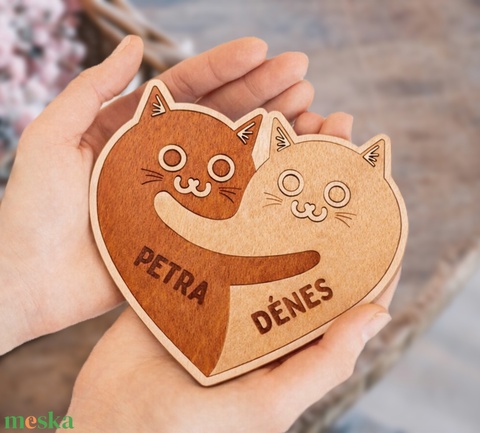 Személyreszabható fa poháralátét cicákkal - Valentin-napi ajándék pároknak