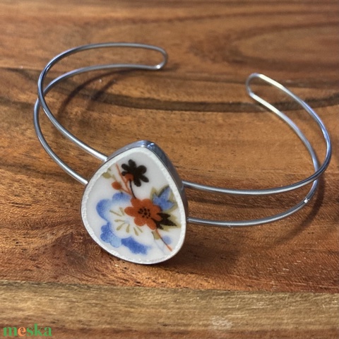 Mentett porcelán darabok - virágos nemesacél karperec - állítható