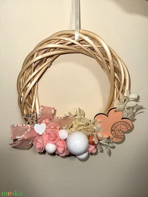 - Anyaga: vesszőkarika, fa díszek, puha virágok