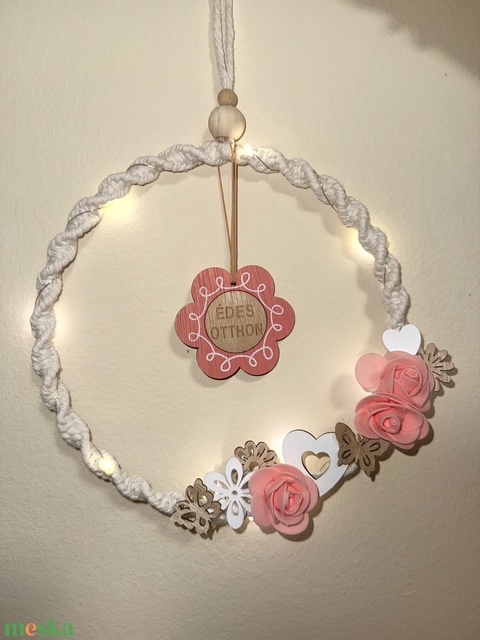 - Anyaga: makramé fonal, fa díszek, puha virágok