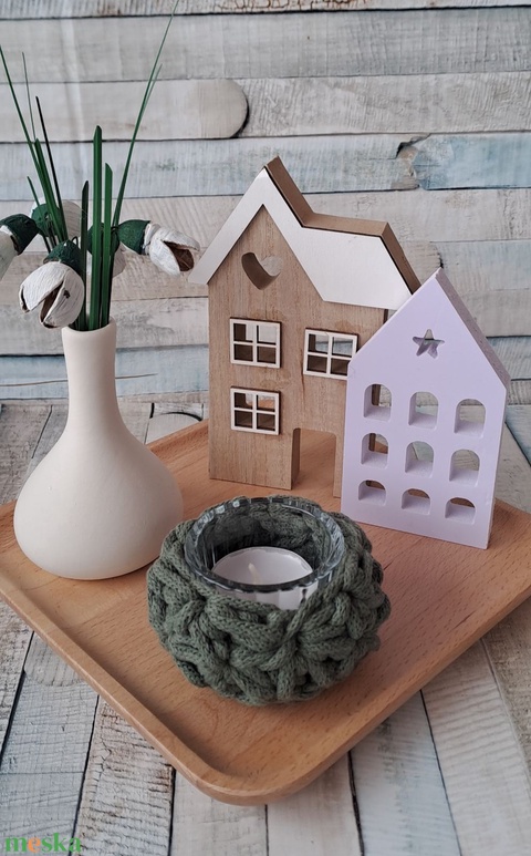 Hóvirágos asztali dekoráció, mécsestartóval, házikóval