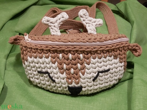 Gida női övtáska újrahasznosított pamut zsinórfonalból kézzel, horgolástechnikával készült, állítható (70-130 cm) pánttal, így akár vállon keresztben átvetve is kényelmesen hordható. Méretei: 30x16x7 cm. A pánt fonalvarrás technikával, ugyanabból a zsinórfonalból készült, mint a táska, hogy minden szépen harmonizáljon.