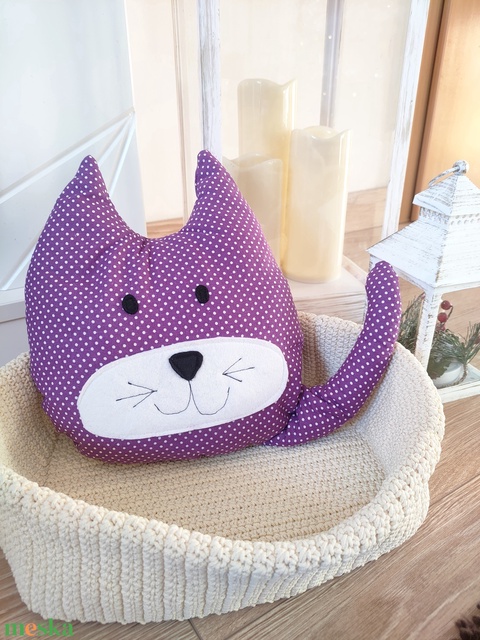 Lila pöttyös cica párna - Cica Figura - Cicás díszpárna - Textil játék - Macska Textil figura