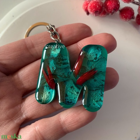 M - betűs kulcstartó valódi szirmokkal, névre szóló ajándék