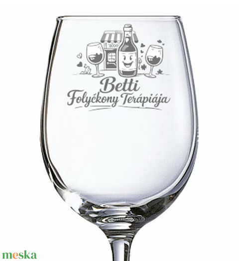 A poháron látható játékos boros–italos motívumok a klasszikus „gyógyszeres” hangulatot boros köntösbe bújtatják, így a minta egyszerre vicces és stílusos. A névre szóló gravírozás (pl. Betti Folyékony Terápiája) igazán személyessé és emlékezetessé teszi az ajándékot.