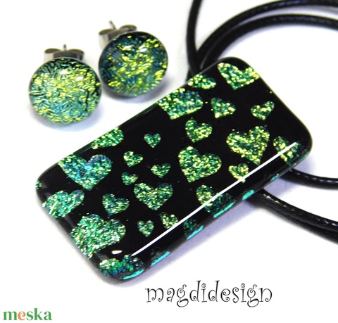 Arany-türkiz szívecskés üvegékszer szett nyaklánc, fülbevaló - Valentin napra, Anyák napjára, Nőnapra
