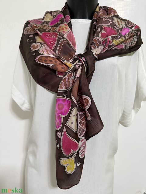Kézzel festett 100% hernyóselyem sál – „Édes Szívek” (35×130 cm, egyedi darab)