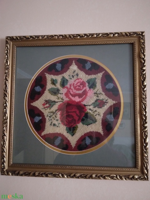 A képkeret mérete: 40 cm x 40 cm, a kerek kép átmérője : 26 cm.Gyapjú fonallal van varrva, gyönyörű arany keretben.