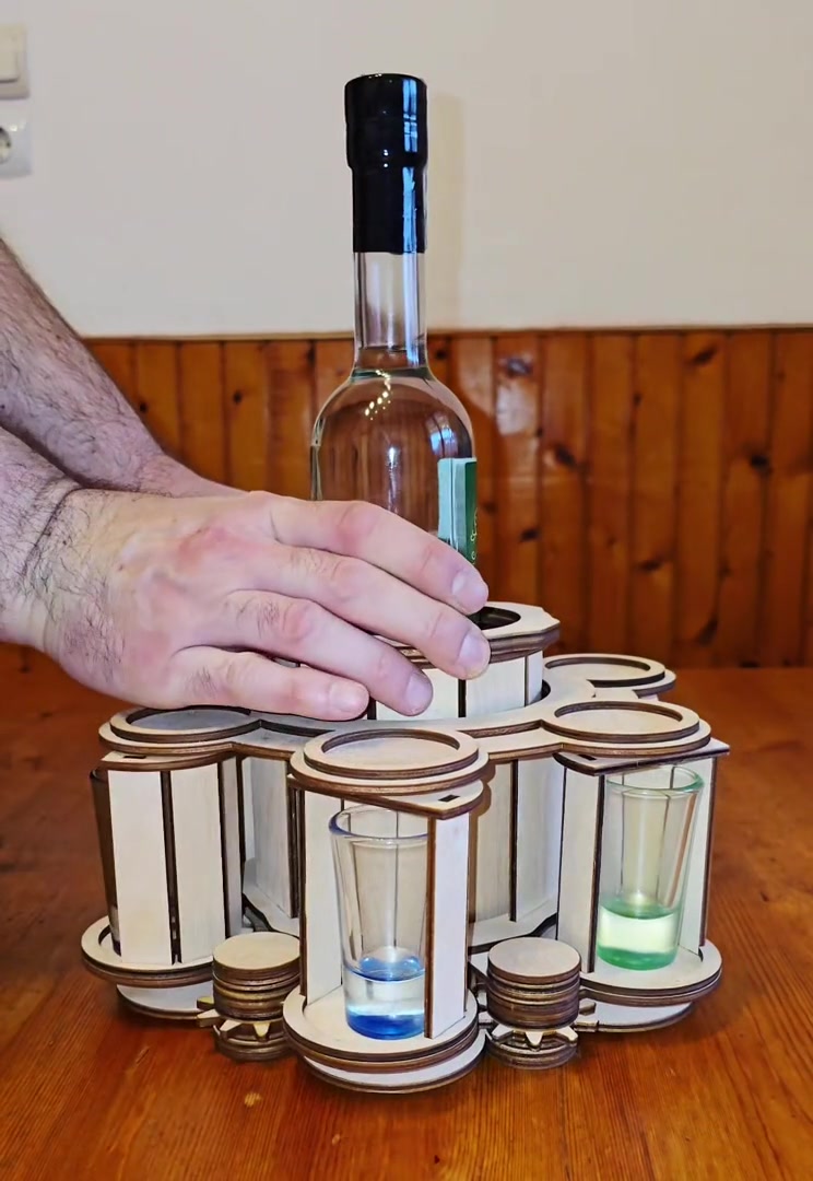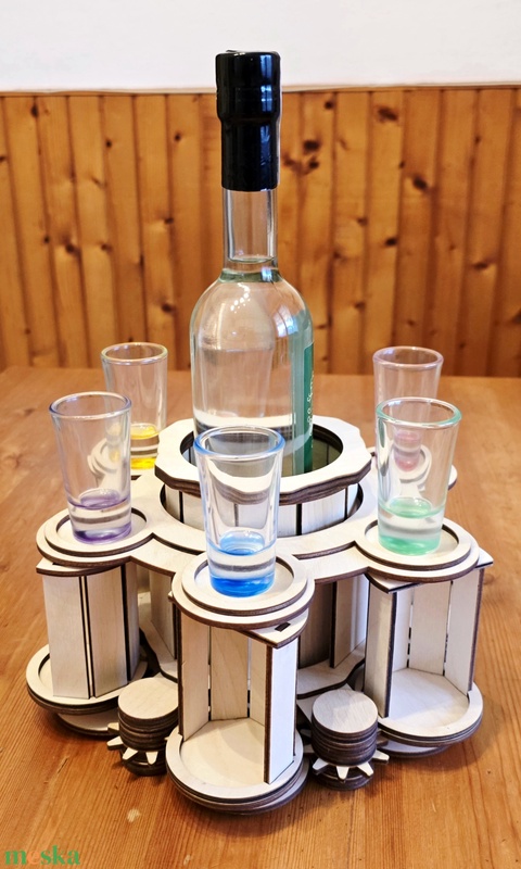 Fa italtartó szett – palacktartó 6 felespohár helyével (kézműves) (nem „pohártartó”, hanem élmény!)
