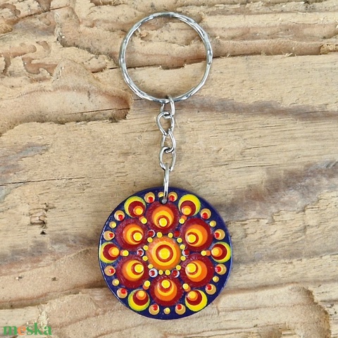 Fa kulcstartó, kulcskarika, táskadísz pontfestéssel (narancs mandala)