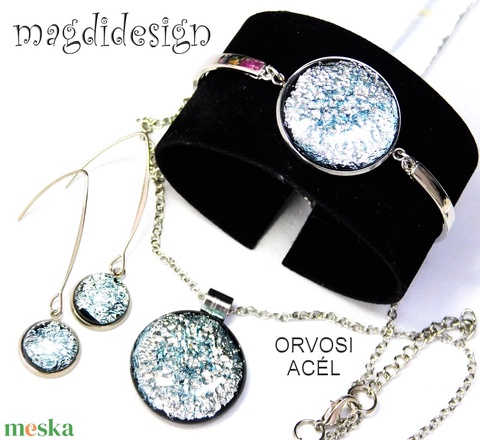 Ezüst dichroic üvegékszer szett nyaklánc, karkötő, lógós fülbevaló 1
